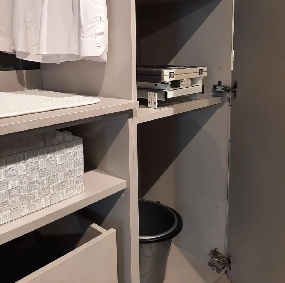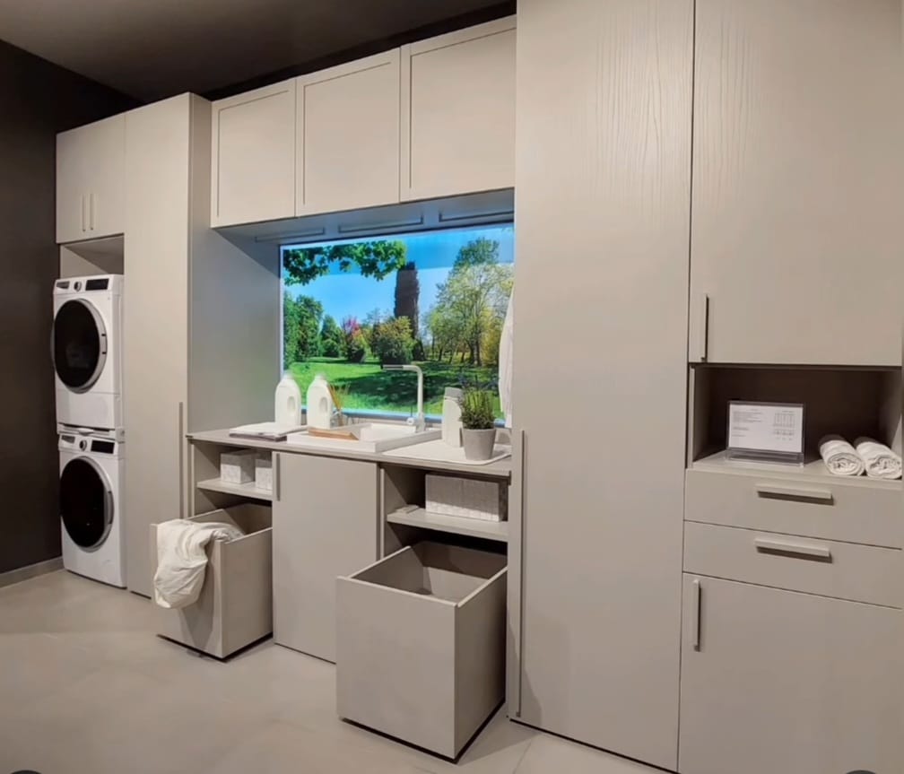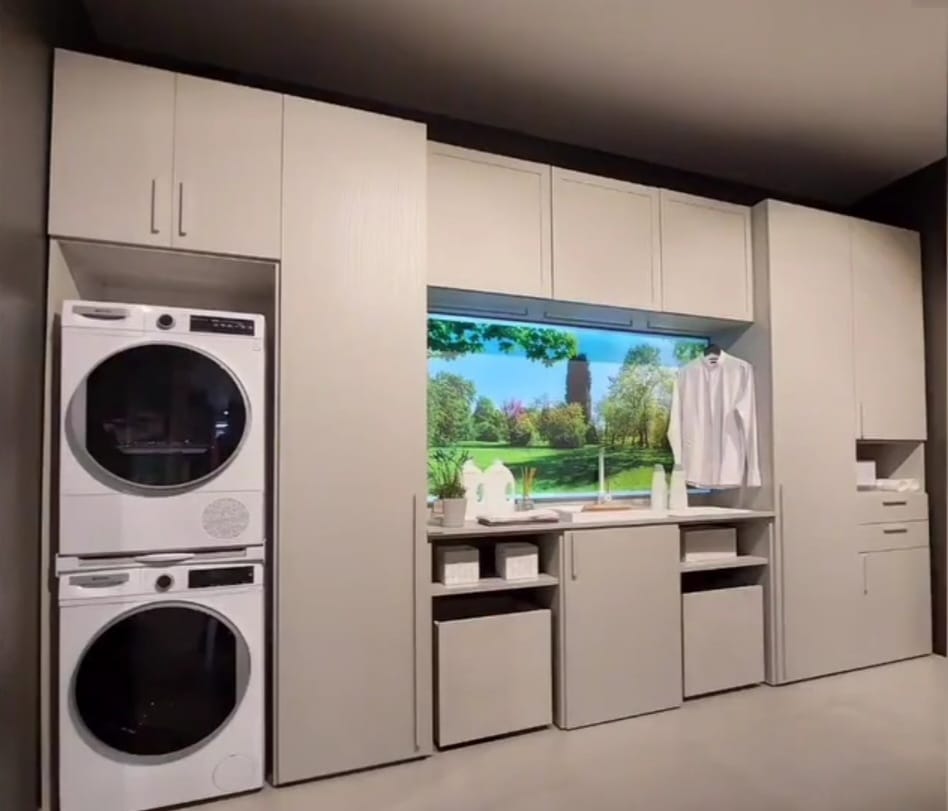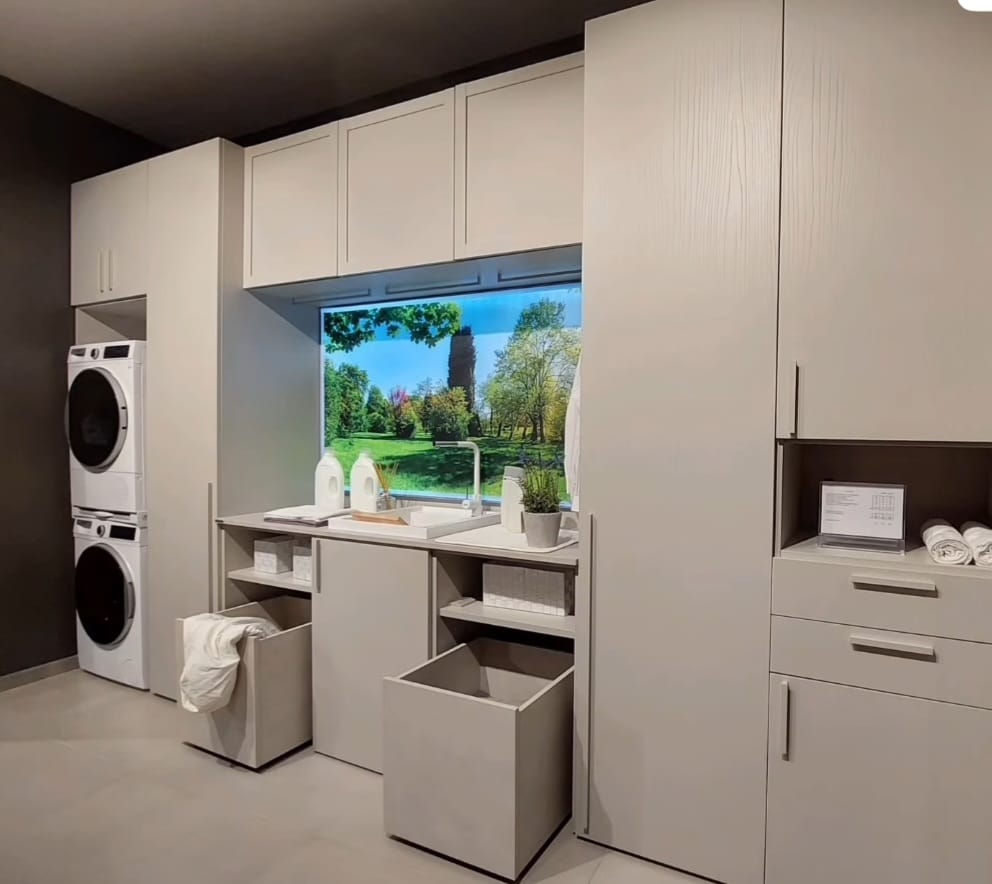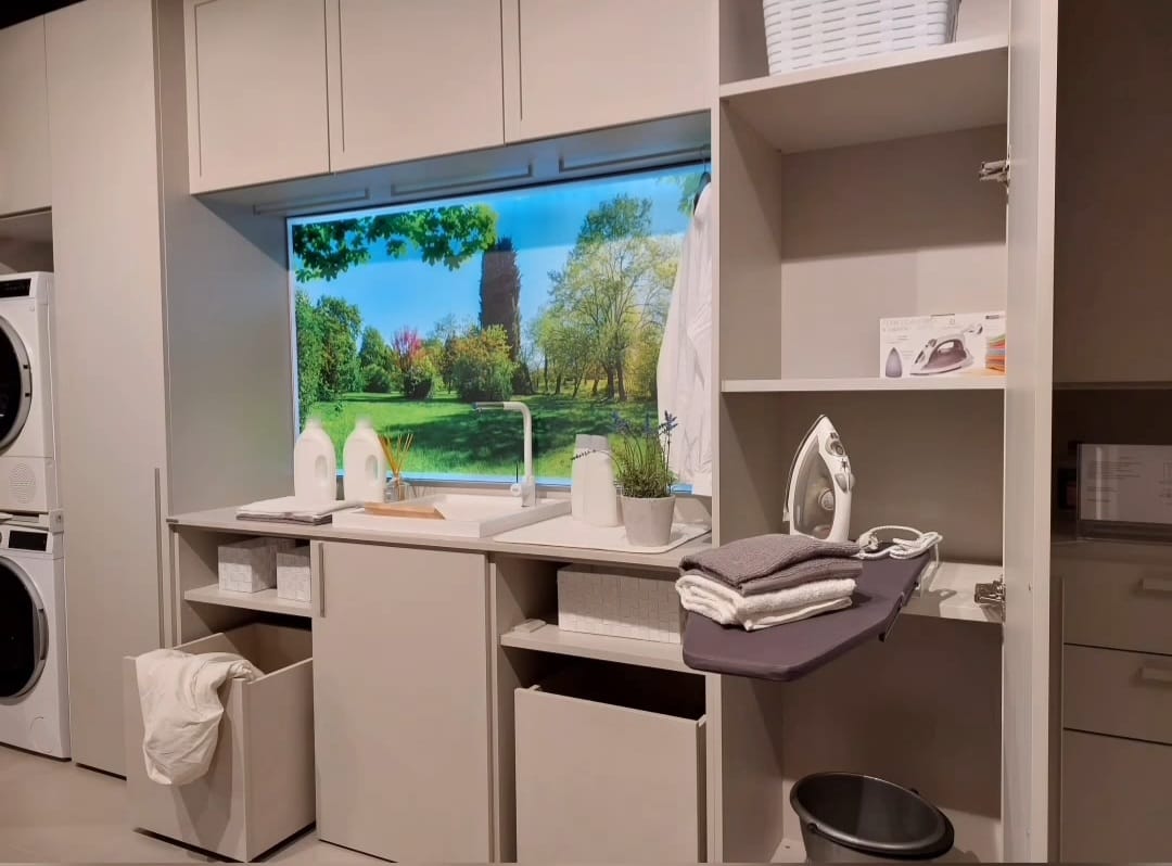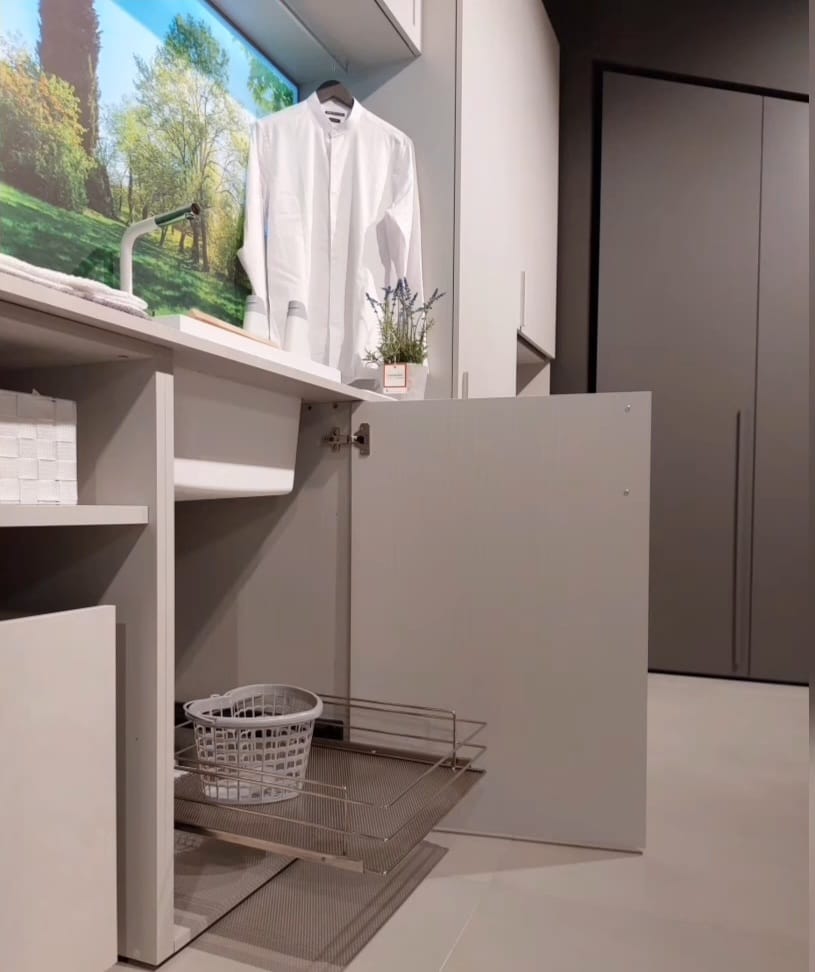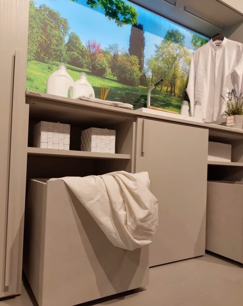 Lavanderia Attrezzata Febal colore grigio chiaro frassinato, composta da colonna per lavatrice/asciugatrice, 2 colonne, asse da stiro estraibile, lavapanni con miscelatore, 2 contenitori su ruote porta biancheria, vani contenitori e pensili.